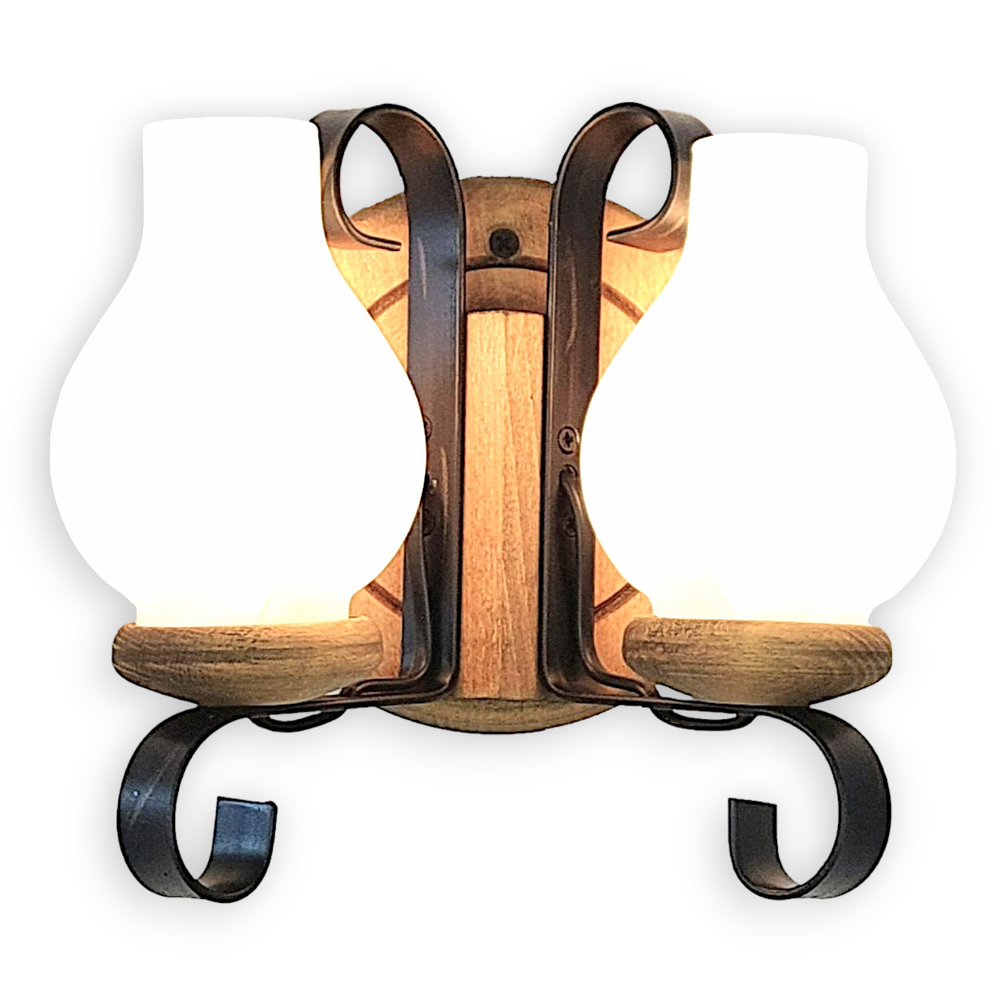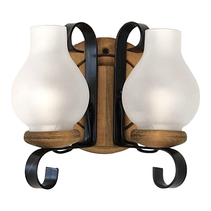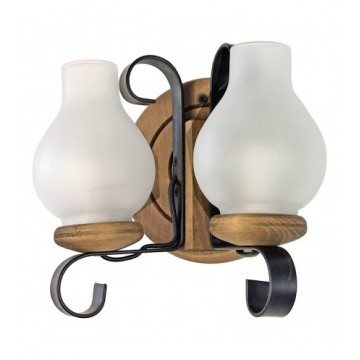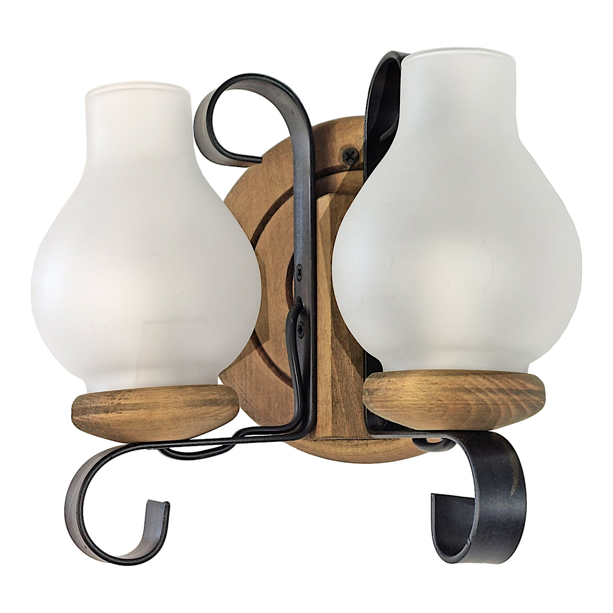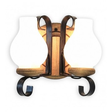 Această aplica de perete rustică este o piesă de iluminat care îmbină calitatea și estetica materialelor naturale cu un stil tradițional. Suportul central este fabricat din lemn de fag, un material rezistent și durabil, cu o culoare bogată și o textură plăcută. Aspectul lemnului este natural, prezervând frumusețea organică a acestuia. Fierul forjat are un aspect elegant și robust, cu detalii decorative care adaugă un caracter autentic întregii piese.Aplica dispune de două dulii de tip E14, ceea ce o face versatilă în alegerea surselor de lumină, fiind compatibilă cu becuri LED, halogen sau incandescente. Abajururile sunt realizate din sticlă mată, care difuzează lumina și creează o atmosferă caldă și primitoare. Forma lor amintește de opaițe, adăugând un aer vintage și confortabil.În ansamblu, această aplica este perfectă pentru a adăuga un accent rustic și o lumină caldă în orice cameră, de la un living până la un hol sau o sufragerie, și se potrivește bine în decoruri care îmbină elemente naturale cu accente antice sau vintage.