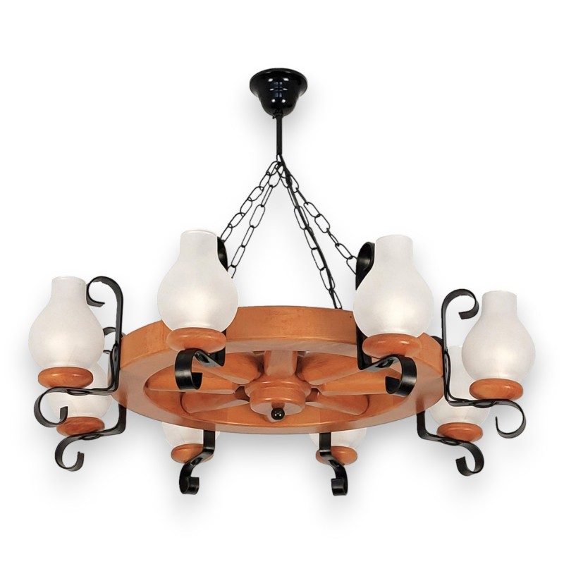 Acest candelabru rustic combină tradiția și modernitatea pentru a crea o piesă de iluminat cu adevărat remarcabilă. Central în design este o structură din lemn de fag, sculptată minuțios în forma unei roți cu spițe, care amintește de roțile de car din vremuri de demult. Lemnul prezintă o textură naturală și o nuanță caldă, care accentuează aspectul rustic al candelabrului.Suspendat de tavan printr-un lanț de fier negru, candelabrul conferă o prezență puternică, echilibrând elementele naturale cu cele industriale. Brațele de fier forjat, care susțin abajururile, se îndoaie elegant și sunt finisate în negru pentru a complementa lanțul și pentru a adăuga o notă de rafinament.Candelabrul are opt surse de lumină, fiecare încoronată de un abajur din sticlă mată care difuzează lumina, oferind o iluminare blândă și atrăgătoare. Forma abajururilor este clasică și plină de farmec, aducând aminte de lumina caldă a opaițelor.Această piesă de iluminat este ideală pentru a adăuga o notă distinctivă și o atmosferă primitoare în orice încăpere, fie că este vorba de un living, o sală de mese sau un hol. Designul său unic este o alegere excelentă pentru cei care doresc să combine elemente tradiționale cu confortul modern în decorul lor interior.