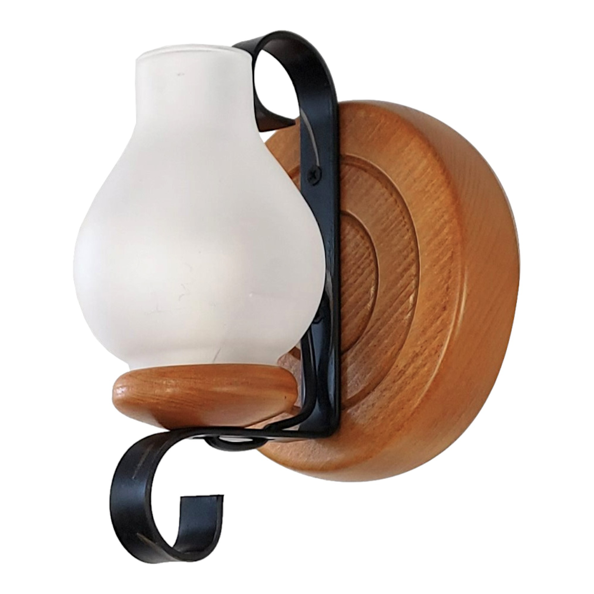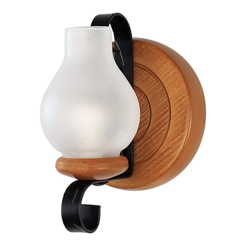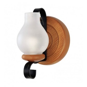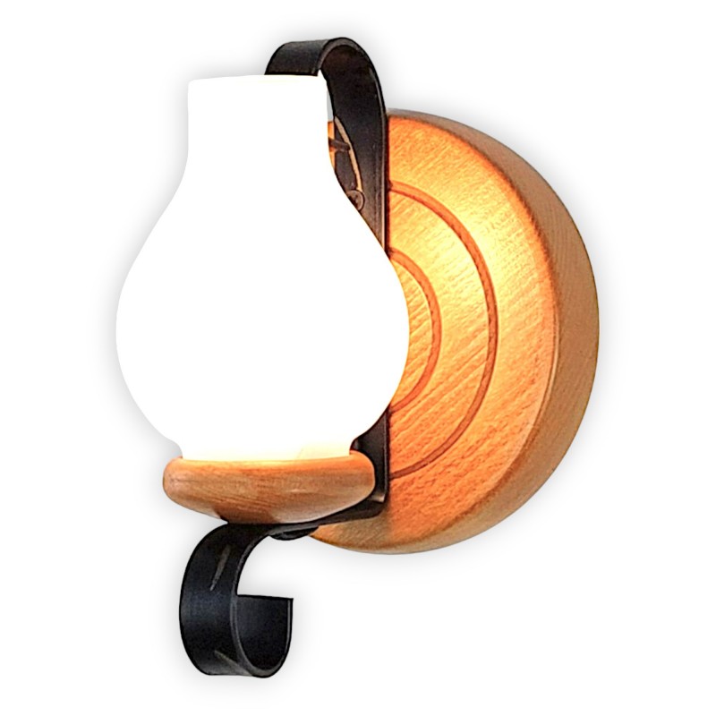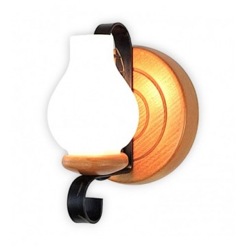 Această aplica de perete rustică in forma de roata are un design care combină elemente tradiționale cu funcționalitatea modernă. Este construită din lemn de fag, recunoscut pentru rezistența și durabilitatea sa, și fier forjat, ce adaugă un accent autentic și robust. Fierul forjat este folosit pentru a forma suportul lămpii, având o culoare întunecată care contrastează plăcut cu nuanța mai caldă a lemnului. Designul fierului are linii curbe care se termină într-un cârlig decorativ deasupra abajurului, adăugând o notă de eleganță.Abajurul este realizat din sticlă mată, care difuzează lumina și creează o atmosferă caldă și primitoare. Forma sa este simplă și tradițională, reminiscentă a lămpilor de odinioară, contribuind la estetica rustică a aplicei.Sistemul de iluminare este adaptat pentru o dulie de tip E14, care este destul de standard și permite utilizarea unei game largi de becuri, de la cele incandescente la cele LED, care sunt mai eficiente energetic.În ansamblu, aplica este o combinație armonioasă între materiale naturale și manufactură artizanală, fiind potrivită pentru decoruri ce îmbină tradiționalul cu modernul, de la cabane montane până la locuințe urbane cu un design interior rustic sau vintage.