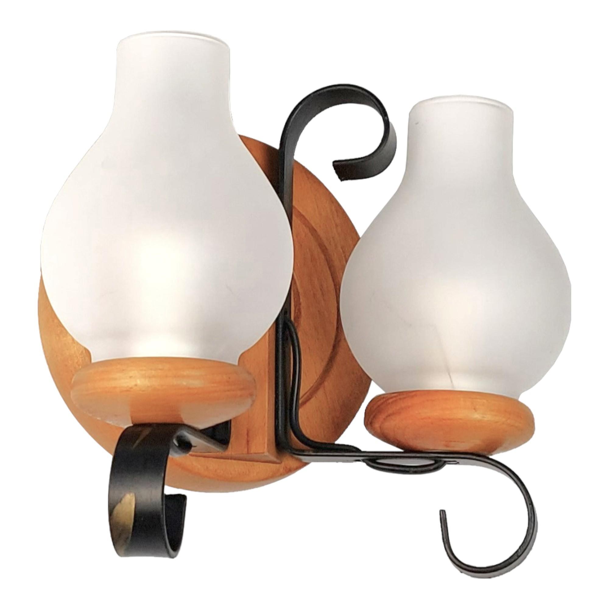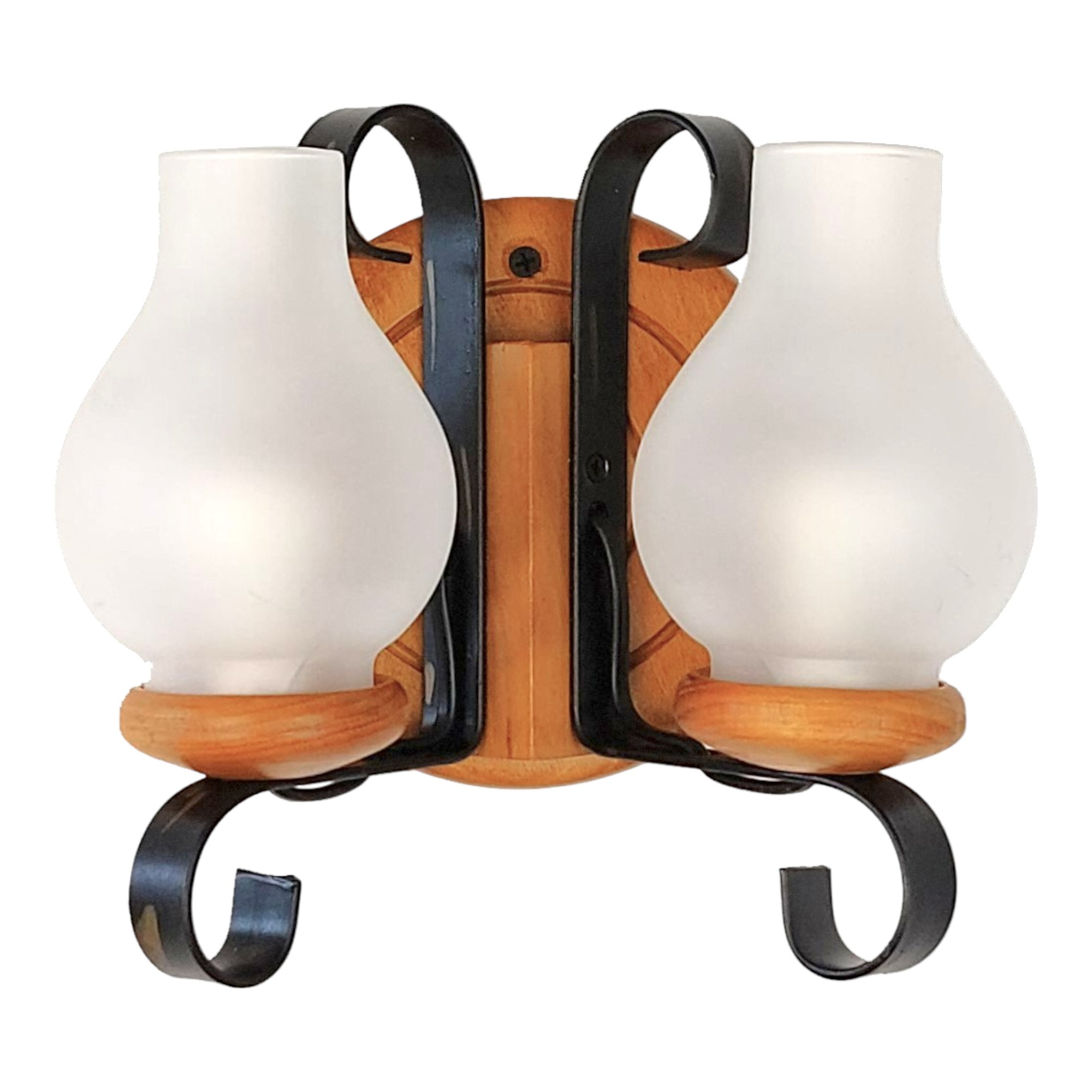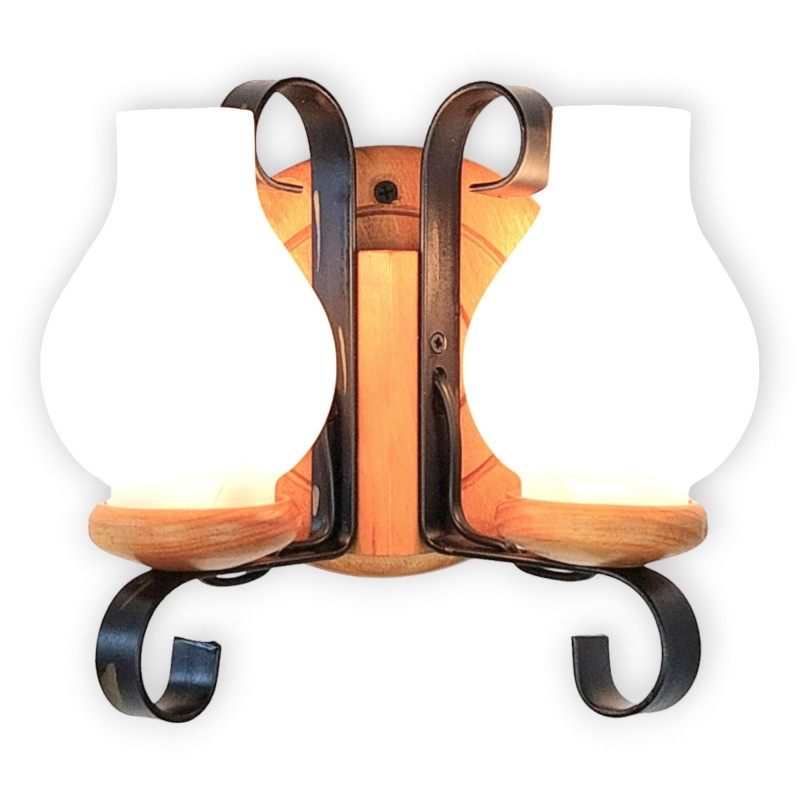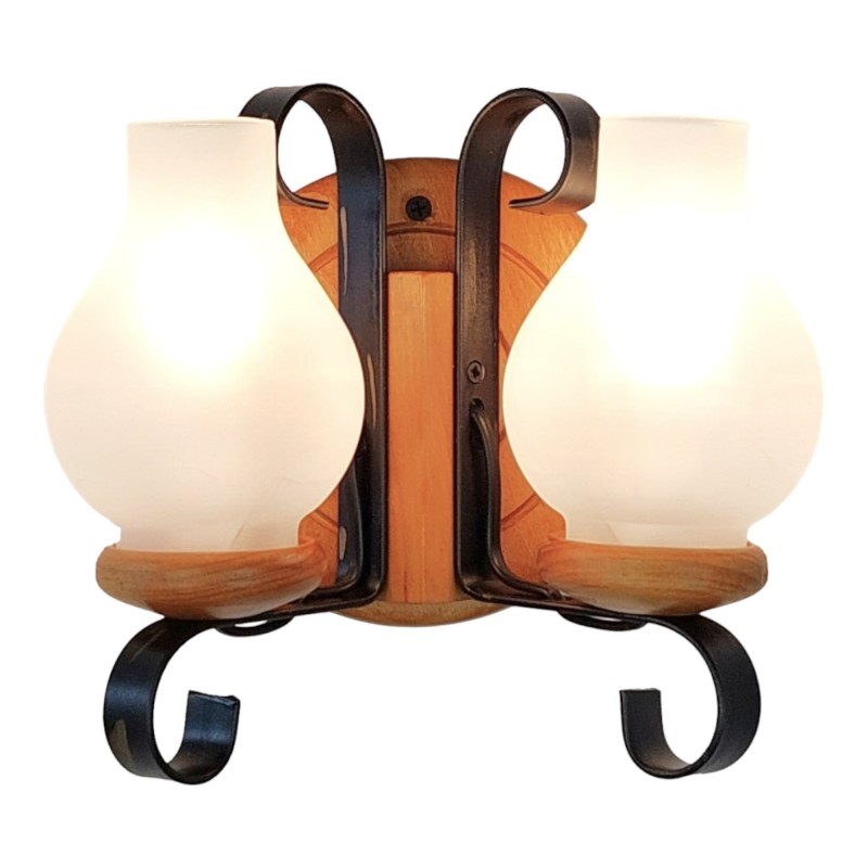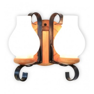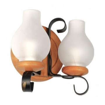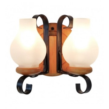 Această aplica de perete rustică este o piesă de iluminat care îmbină calitatea și estetica materialelor naturale cu un stil tradițional. Suportul central este fabricat din lemn de fag, un material rezistent și durabil, cu o culoare bogată și o textură plăcută. Aspectul lemnului este natural, prezervând frumusețea organică a acestuia. Fierul forjat are un aspect elegant și robust, cu detalii decorative care adaugă un caracter autentic întregii piese.Aplica dispune de două dulii de tip E14, ceea ce o face versatilă în alegerea surselor de lumină, fiind compatibilă cu becuri LED, halogen sau incandescente. Abajururile sunt realizate din sticlă mată, care difuzează lumina și creează o atmosferă caldă și primitoare. Forma lor amintește de opaițe, adăugând un aer vintage și confortabil.În ansamblu, această aplica este perfectă pentru a adăuga un accent rustic și o lumină caldă în orice cameră, de la un living până la un hol sau o sufragerie, și se potrivește bine în decoruri care îmbină elemente naturale cu accente antice sau vintage.