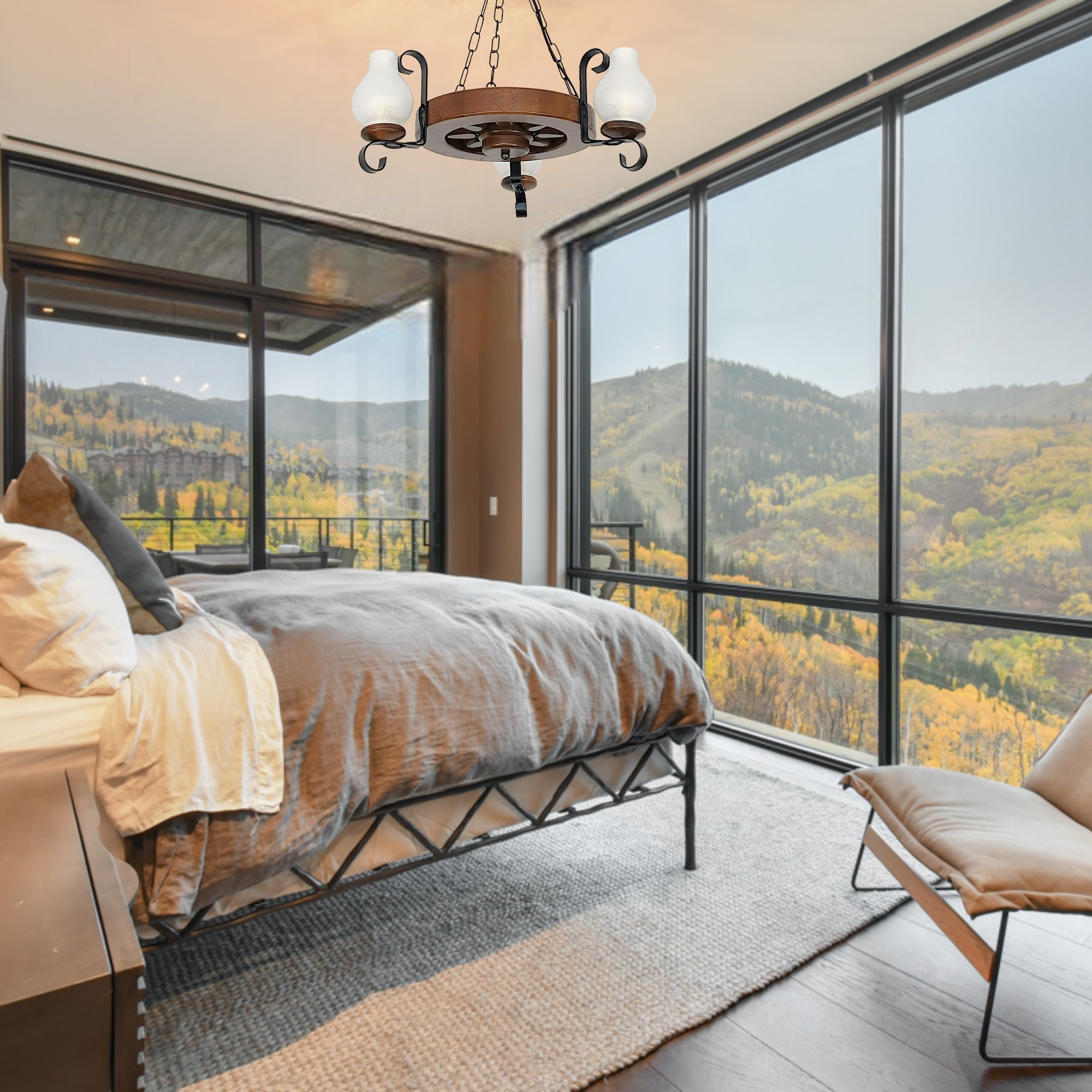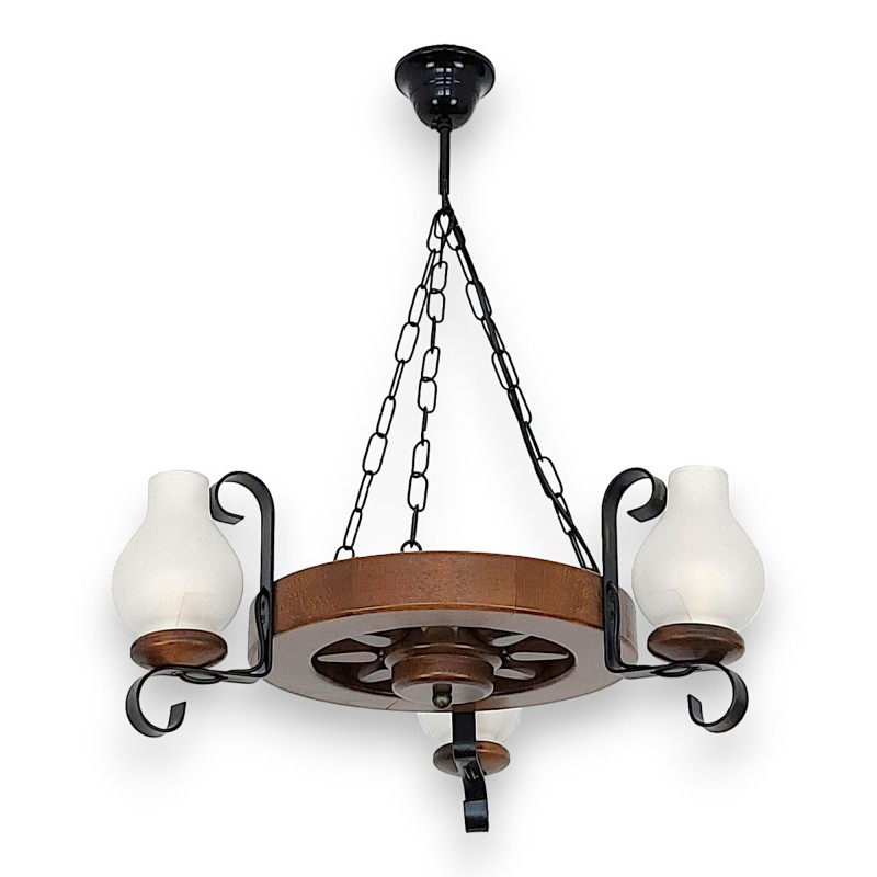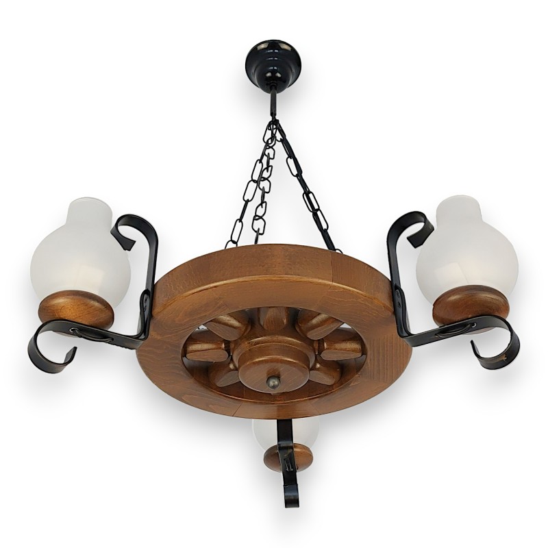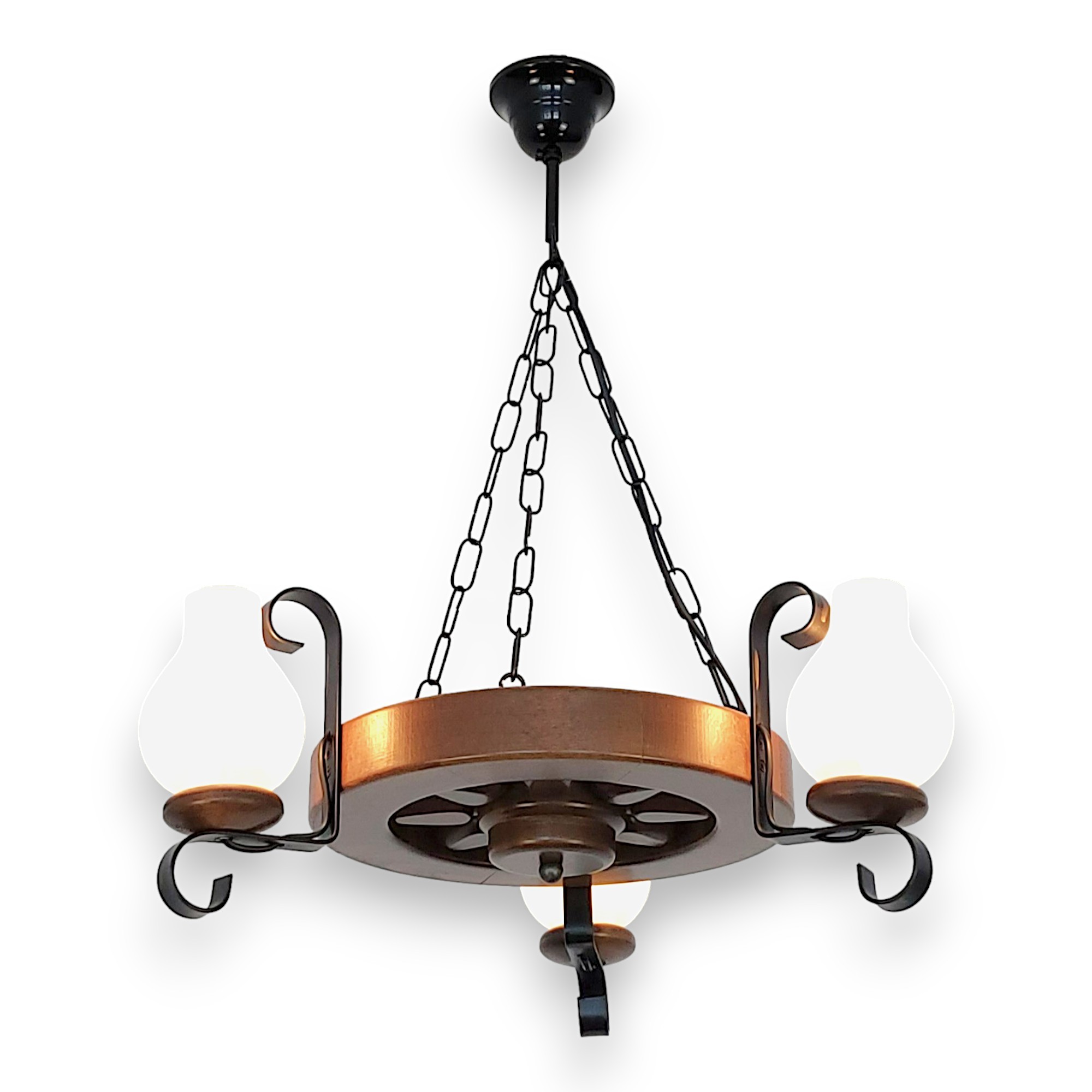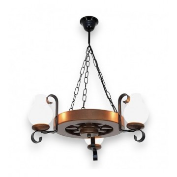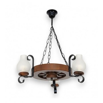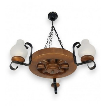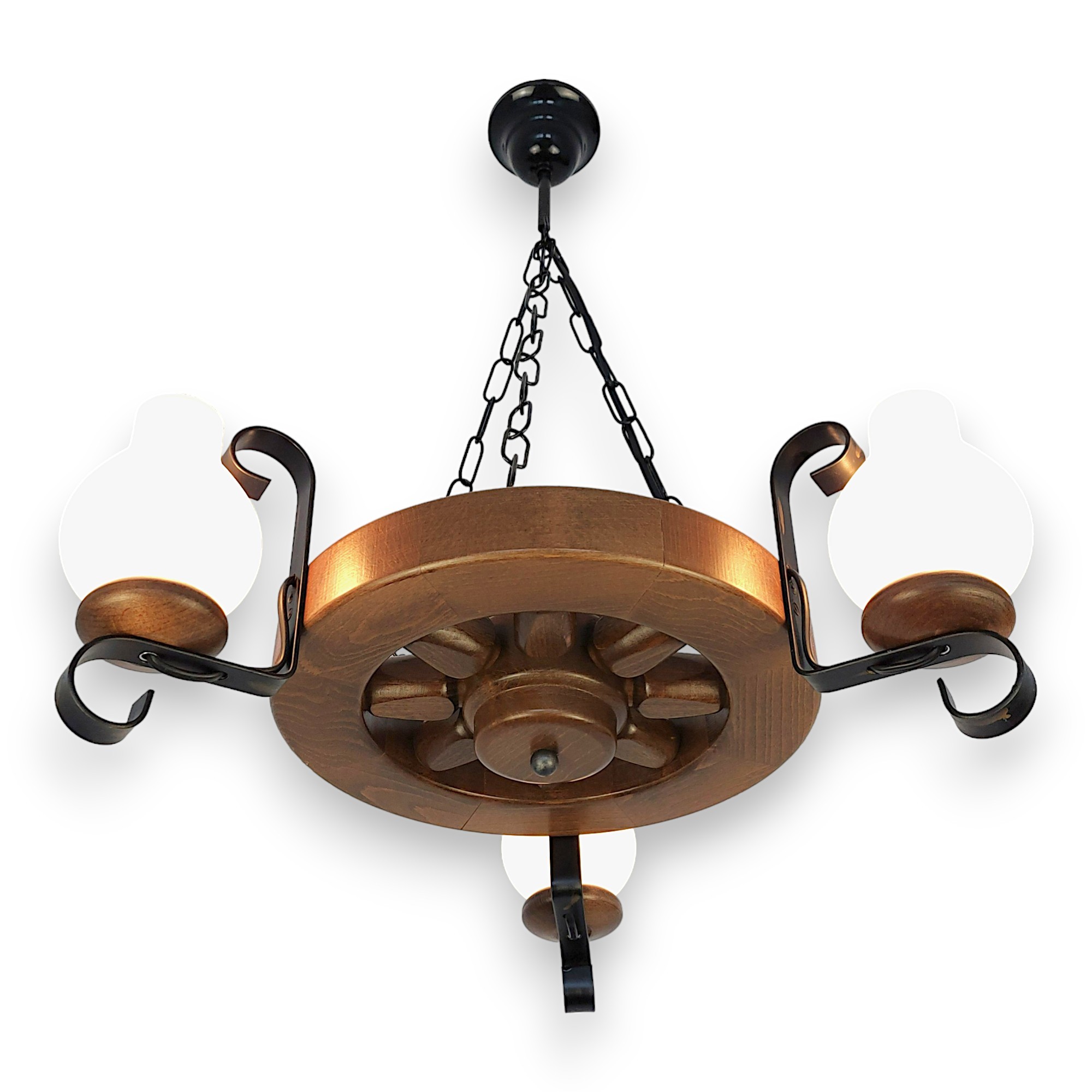Acest candelabru suspendat prezintă un design rustic, inspirat de tehnicile tradiționale de prelucrare a lemnului și fierărie. Elementul central este o structură de lemn de fag, cu aspectul unei roți, care aduce aminte de vechile mori de apă sau de roțile de căruță, emanând o estetică caldă și nostalgică. Lemnul are o culoare bogată și prezintă textura naturală a fibrei, evidențiind calitatea și naturalețea materialului.Suspendat de tavan printr-o lanț de fier negru, robust și simplu, candelabrul pendulează grațios, oferind o senzație de stabilitate și durabilitate. Fierul forjat este de asemenea folosit pentru a crea brațele care țin abajururile, având un finisaj negru care se asortează cu lanțul și adaugă o notă de eleganță.Candelabrul este dotat cu trei dulii E14, fiecare dintre acestea fiind acoperite de un abajur din sticlă mată, care difuzează lumina într-o manieră blândă și ambientală. Forma abajururilor sugerează opaițele tradiționale, completând stilul rustic al candelabrului.Această piesă de iluminat este ideală pentru interioarele care doresc să adauge un accent de caracter și o lumină caldă, cum ar fi sufrageriile, bucătăriile sau sălile de mese în stil rustic, country sau chiar pentru a introduce un element tradițional într-un decor modern. Este o expresie frumoasă a artizanatului și a designului inspirat de natură.