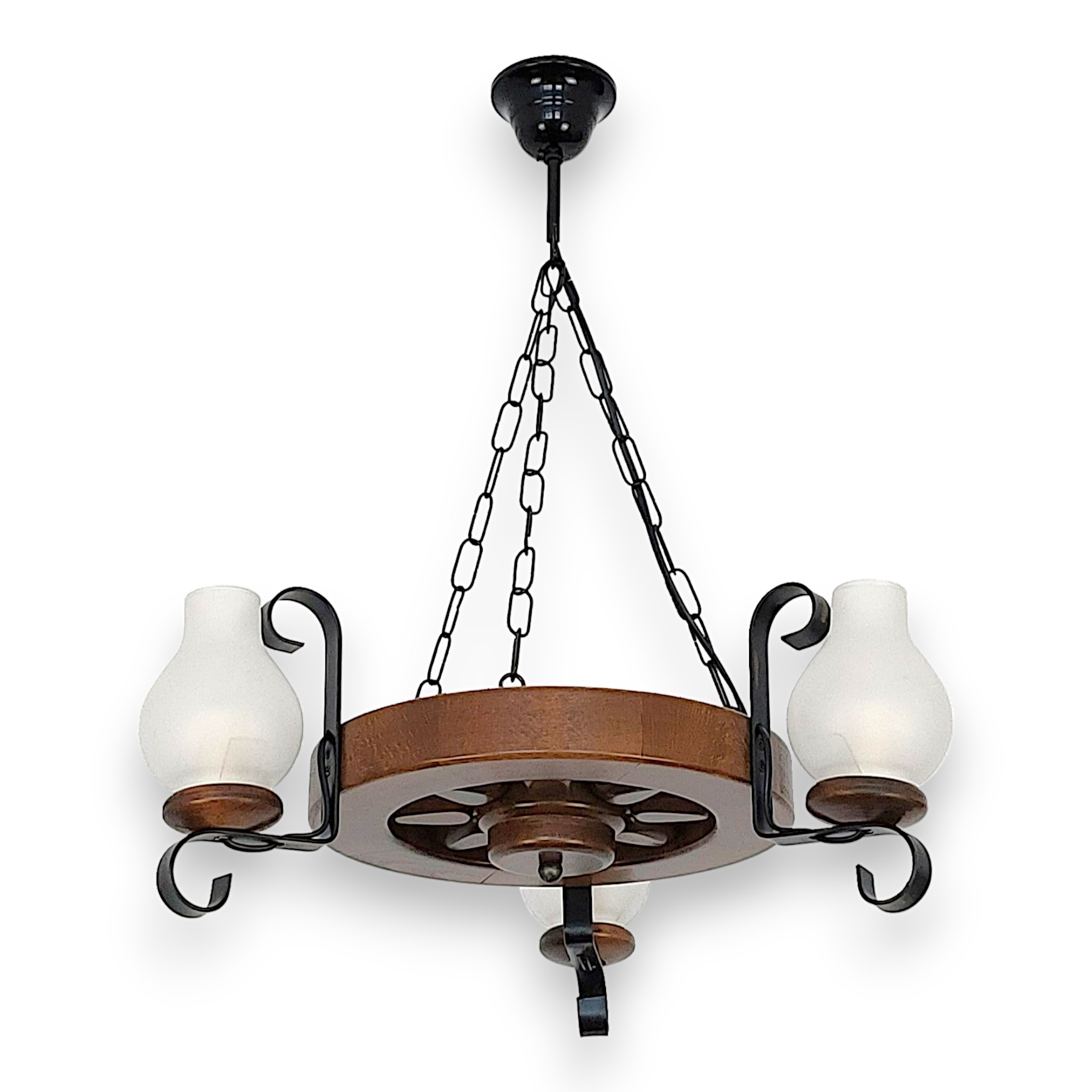 Aplica rustica din lemn masiv de fag finisat wenge , in forma de roata , cu 3 brate din fier forjat si abajururi din sticla mata in forma de opait.