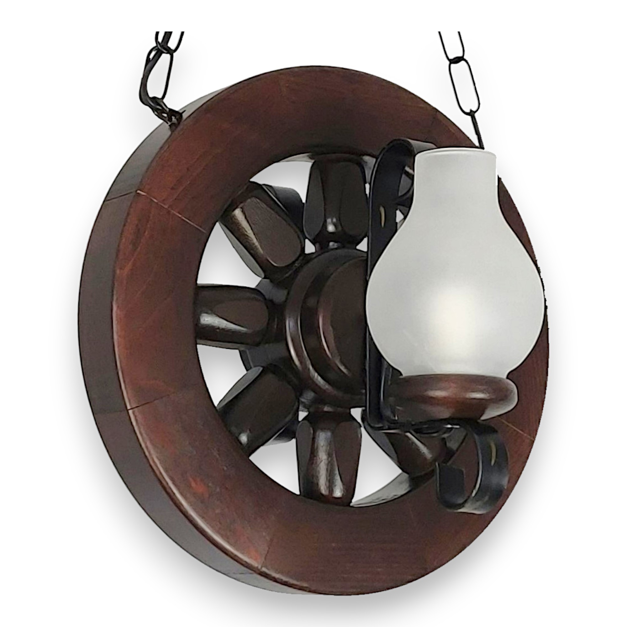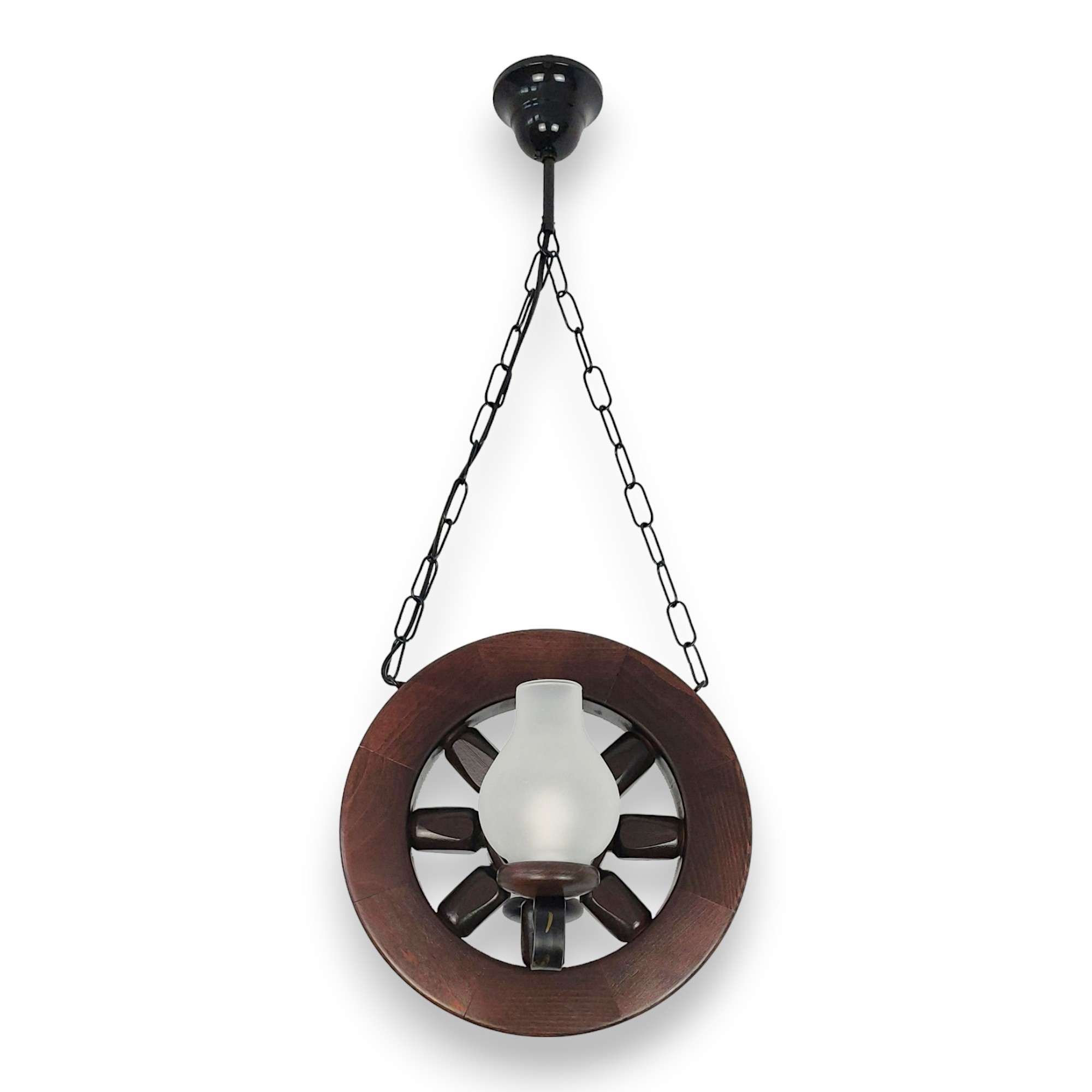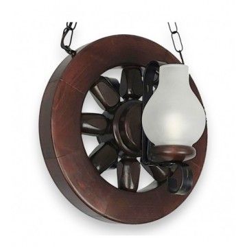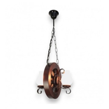 Acest candelabru rustic este o piesă de iluminat suspendată care îmbină elementele naturale cu cele forjate manual, creând un punct de atracție vizuală cald și primitor. Baza candelabrului este realizată din lemn de fag, prelucrat pentru a forma un o roată, evocând un sentiment de robustețe și tradiție. Structura de lemn arată finisaje bine lucrate, cu detalii care subliniază măiestria artizanală și frumusețea naturală a lemnului.Suspendat de tavan printr-o lanț de fier vopsit în negru, acest candelabru conferă un aspect atemporal și o calitate robustă. Fierul forjat este folosit și pentru a crea suporturile elegante care susțin cele două abajururi din sticlă mată. Abajururile au forma clasică a opaițelor, contribuind la estetica generală vintage și rustică a candelabrului.Sistemul de iluminare este proiectat pentru două dulii de tip E14, permitând utilizarea unei varietăți de becuri, de la cele tradiționale la cele moderne, economice, LED. Luminile difuze emanate de abajururile de sticlă mată creează o atmosferă confortabilă și invită la relaxare, fiind ideal pentru zonele de locuit sau de luat masa.În totalitate, candelabrul este o alegere excelentă pentru cei care caută să adauge o notă de căldură și caracter în spațiul lor de locuit, fiind perfect adaptat pentru interioare cu tematică rustică, cabane de munte sau chiar pentru a adăuga un contrast interesant într-un spațiu modern.