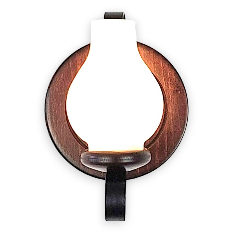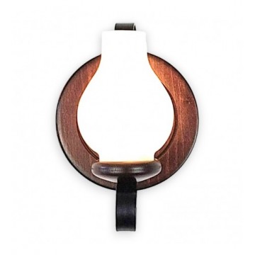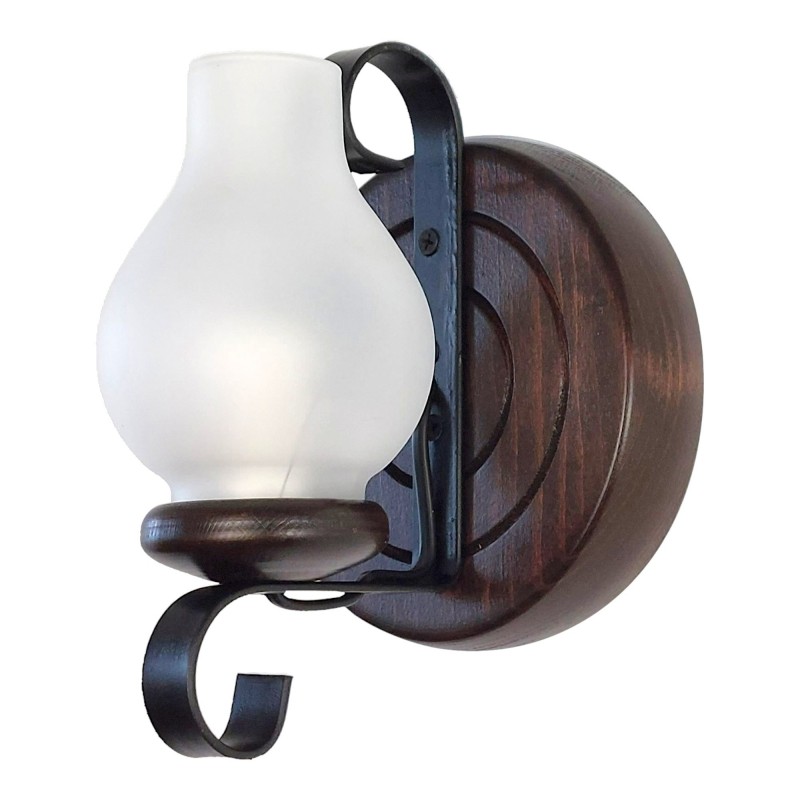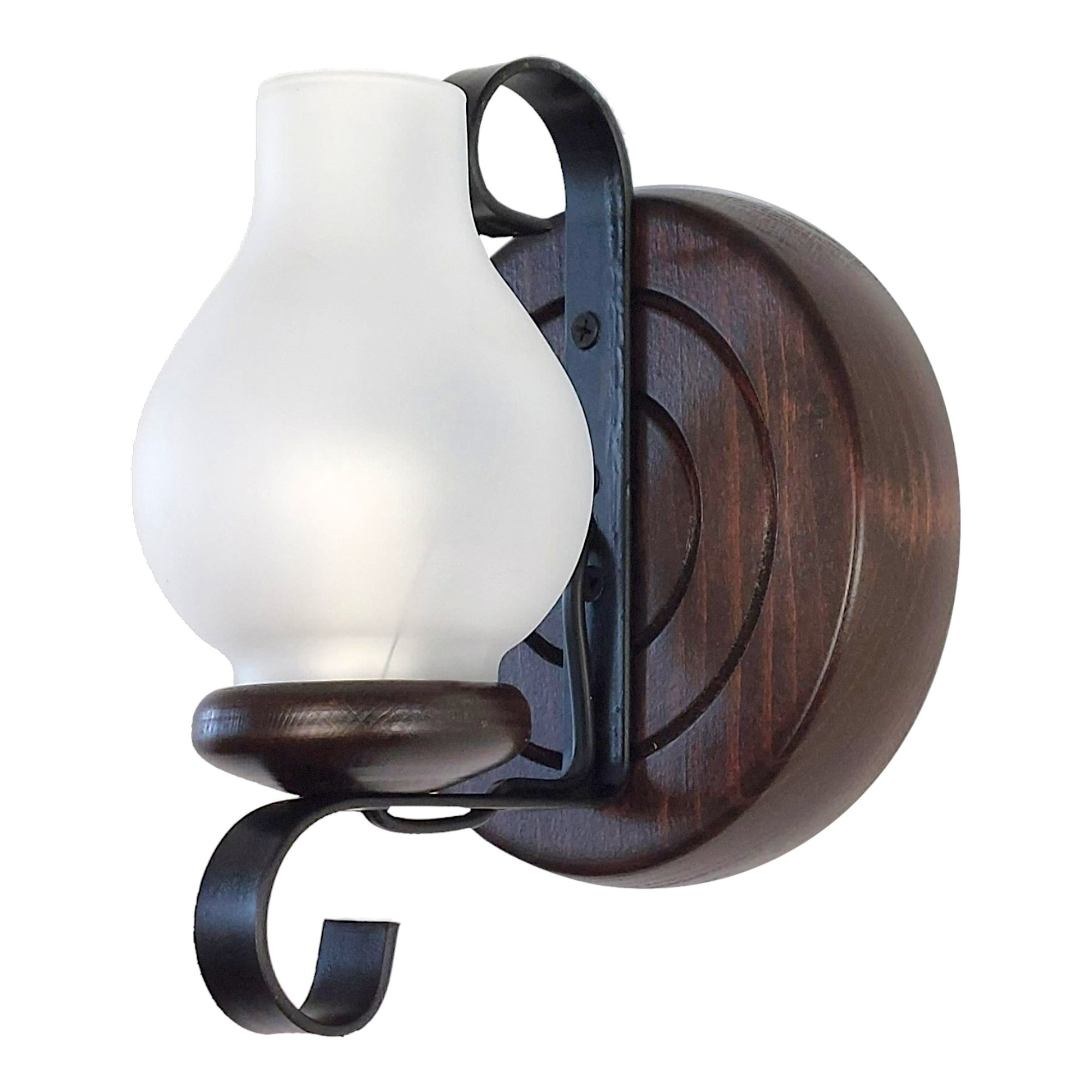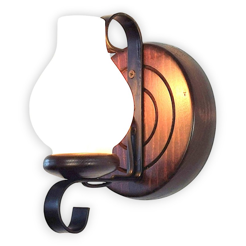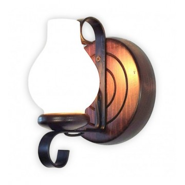 Această aplica de perete rustică in forma de roata are un design care combină elemente tradiționale cu funcționalitatea modernă. Este construită din lemn de fag, recunoscut pentru rezistența și durabilitatea sa, și fier forjat, ce adaugă un accent autentic și robust. Fierul forjat este folosit pentru a forma suportul lămpii, având o culoare întunecată care contrastează plăcut cu nuanța mai caldă a lemnului. Designul fierului are linii curbe care se termină într-un cârlig decorativ deasupra abajurului, adăugând o notă de eleganță.Abajurul este realizat din sticlă mată, care difuzează lumina și creează o atmosferă caldă și primitoare. Forma sa este simplă și tradițională, reminiscentă a lămpilor de odinioară, contribuind la estetica rustică a aplicei.Sistemul de iluminare este adaptat pentru o dulie de tip E14, care este destul de standard și permite utilizarea unei game largi de becuri, de la cele incandescente la cele LED, care sunt mai eficiente energetic.În ansamblu, aplica este o combinație armonioasă între materiale naturale și manufactură artizanală, fiind potrivită pentru decoruri ce îmbină tradiționalul cu modernul, de la cabane montane până la locuințe urbane cu un design interior rustic sau vintage.