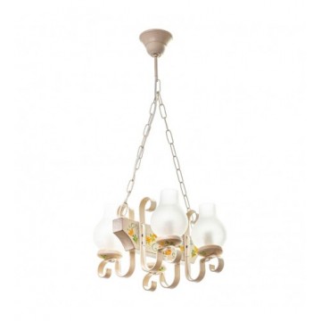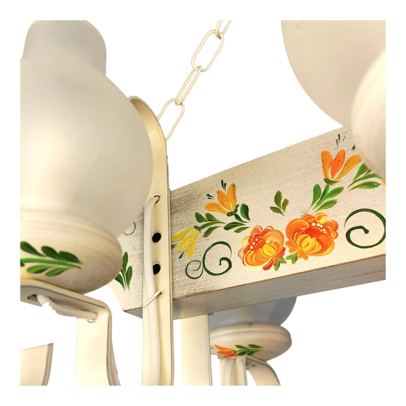 Iluminați-vă căminul cu candelabrul Vela, o piesă de iluminat sofisticată care aduce eleganța și căldura în orice încăpere. Acest candelabru dispune de 4dulii E14, fiind conceput pentru a oferi o lumină ambientală caldă și învăluitoare, perfectă pentru întâlniri intime sau mese în familie.Designul său rafinat este accentuat de motivele florale pictate manual care înfățișează frumusețea și finețea naturii. Aceste detalii artistice sunt aplicate pe elemente de lemn finisat, aducând un omagiu tradițiilor meșteșugărești și transformând fiecare candelabru într-o operă de artă unică.Culorile crem și aurii ale metalului se combină armonios cu abajururile din sticlă opală, creând o atmosferă caldă și primitoare. Lanțul delicat, dar robust, permite ajustarea înălțimii, asigurând flexibilitate și adaptabilitate pentru diverse spații interioare.Candelabrul Vela este mai mult decât un simplu accesoriu de iluminat; este o piesă centrală în decorul dumneavoastră, un punct de atracție care va aduce povestea și căldura tradițiilor românești în casa dumneavoastră. Alegeți acest candelabru pentru a aduce o lumină de poveste și un stil rafinat în spațiul dumneavoastră de locuit.